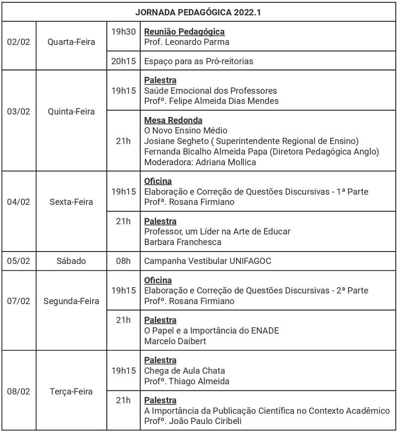 Entre os dias 02 e 08 de fevereiro o Centro Universitário UNIFAGOC irá realizar junto ao corpo docente a Jornada Pedagógica 2022.1. A ação tem o objetivo de promover o aprimoramento das habilidades profissionais para a prática docente.