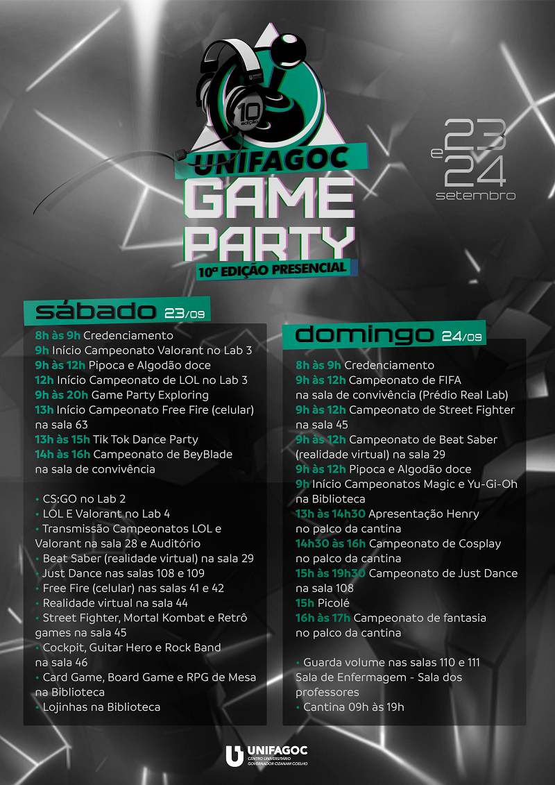 Confira o cronograma do UNIFAGOC GAME PARTY 2023: