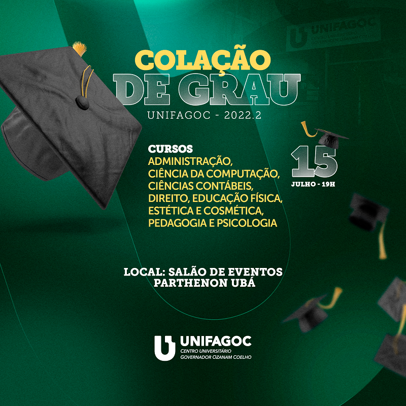 A colação de grau dos cursos de Administração, Ciência da Computação, Ciências Contábeis, Direito, Educação Física, Estética e Cosmética, Pedagogia e Psicologia é um evento exclusivo para familiares, amigos e demais convidados dos formandos do UNIFAGOC, que receberão convite individual para acesso ao local da cerimônia.