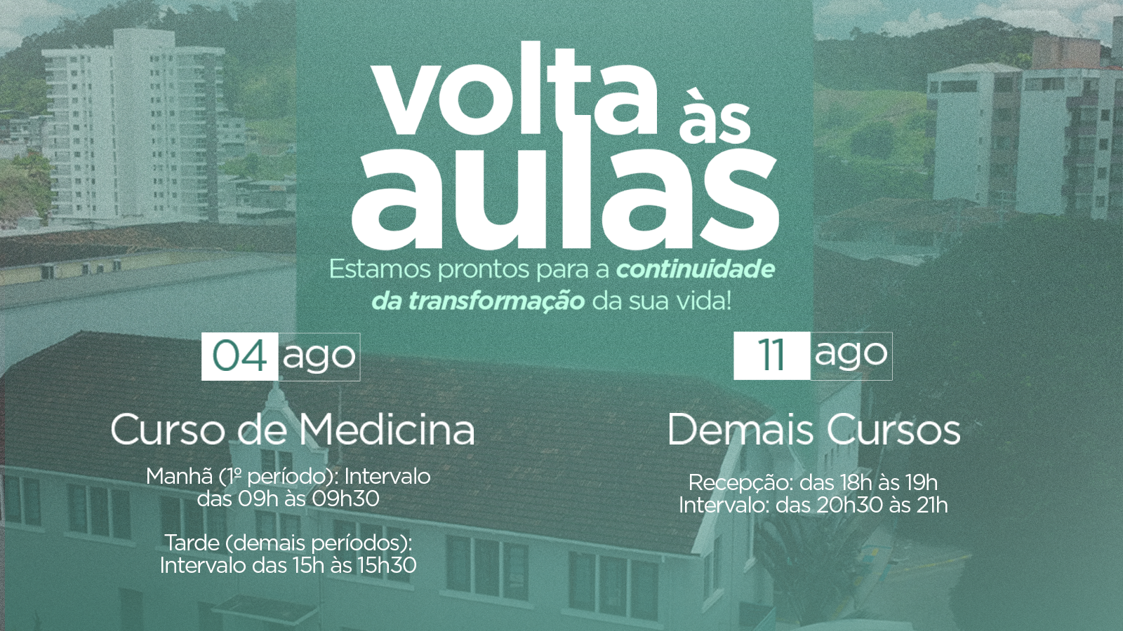 No dia 04 de agosto (segunda-feira), os alunos do curso de Medicina retornam às atividades acadêmicas com uma recepção especial organizada pela instituição. Já os estudantes dos demais cursos de graduação iniciam o semestre na segunda-feira seguinte, 11 de agosto.
