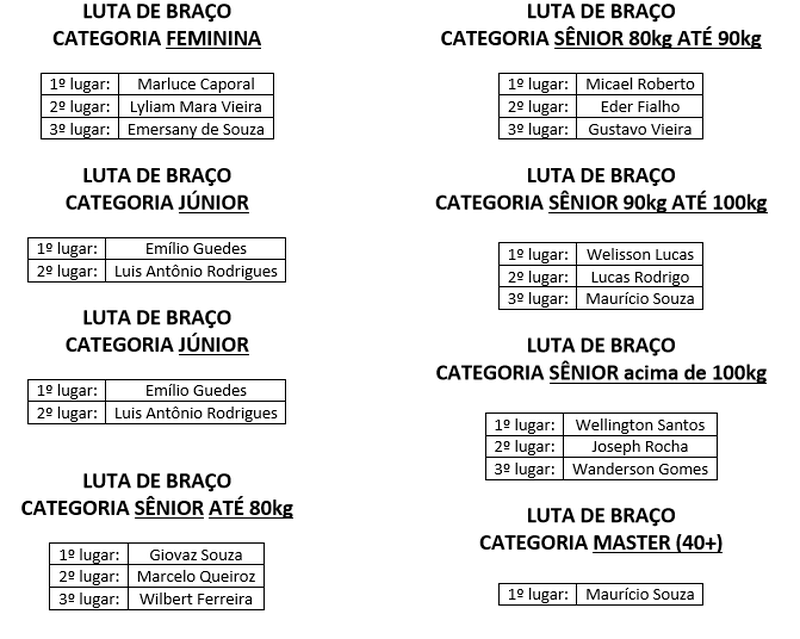 O evento foi organizado pela Fagoc e pelo Centro de Treinamento G2, com a supervisão e arbitragem da Associação Mineira de Luta de Braço (A.M.L.B). As disputas foram validadas como seletiva para o Torneio Mineiro de Luta de Braço. Confira abaixo o resultado geral: