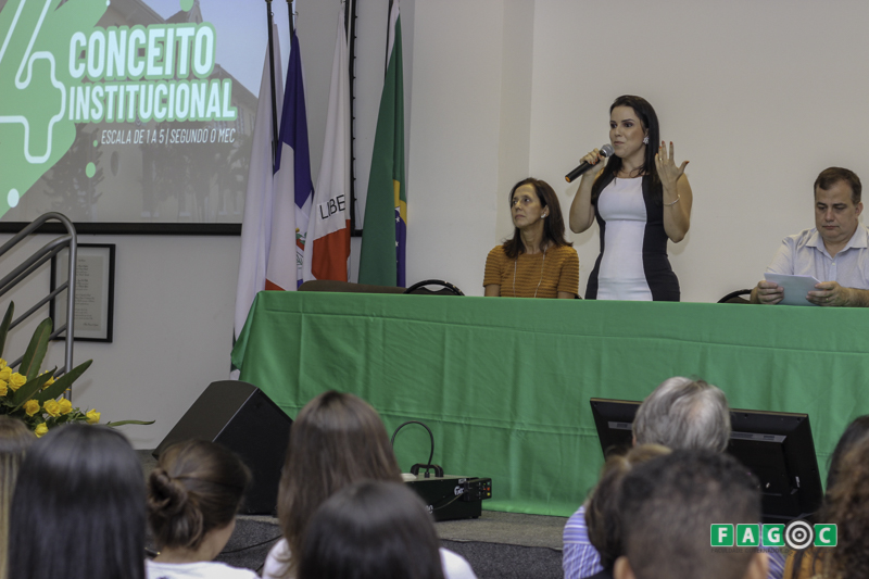 Registro da fala de boas-vindas da coordenadora do curso de Enfermagem da Fagoc, France Coelho