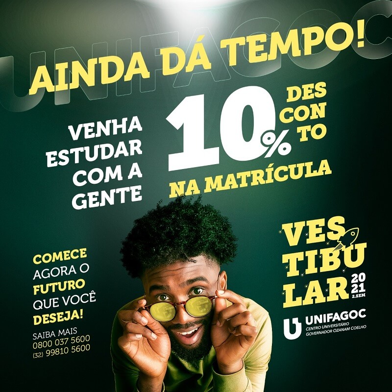 O UNIFAGOC oferece mais uma chance para começar agora o futuro que você deseja. Realize a prova do Vestibular para o segundo semestre de 2021 e ganhe desconto de 10% na matrícula, até o dia 14 de setembro.