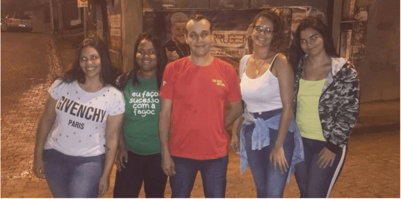 Ao cento da imagem, o vendedor de cachorro-quente Cristhian, acompanhado das alunas do curso de Pedagogia responsáveis pelo trabalho