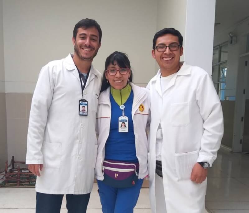 À esquerda da foto, o estudante de Medicina da UniFagoc Braian Campos durante seu estágio na Peru.