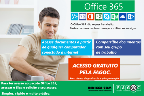 Office 365 é o novo benefício da Fagoc para os alunos. Trata-se de um pacote da Microsoft que funciona inteiramente online, não sendo necessária nenhuma instalação no computador. O estudante cria uma conta e tem acesso a diversas ferramentas do Office, entre elas o Word, Excel e PowerPoint. A ferramenta é ofertada gratuitamente aos estudantes de graduação e pós-gradução da faculdade.