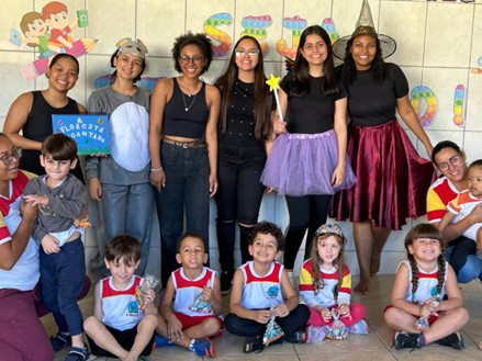 Os alunos foram divididos em 4 grupos e criaram um livro com uma história infantil e um jogo com a temática da história para trabalhar com as crianças em uma data marcada.