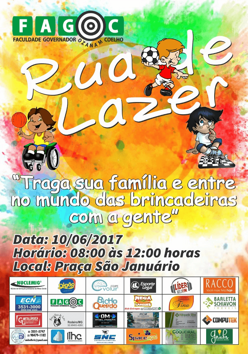 No dia 10 de junho (sábado), acontece a Rua de Lazer na Praça São Januário, das 8h às 12h. O evento gratuito é organizado pelos alunos do terceiro e quinto períodos de Educação Física da Fagoc, com supervisão dos professores Victor Lavorato e Marli Júlio.