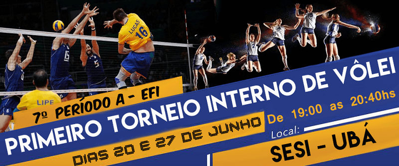 Nos dias 20 e 27 de junho, acontece o Primeiro Torneio Interno de Vôlei do 7º Período A do curso de Educação Física. A iniciativa faz parte da disciplina Metodologia do Voleibol e será realizada no Sesi, de 19h às 20h40.