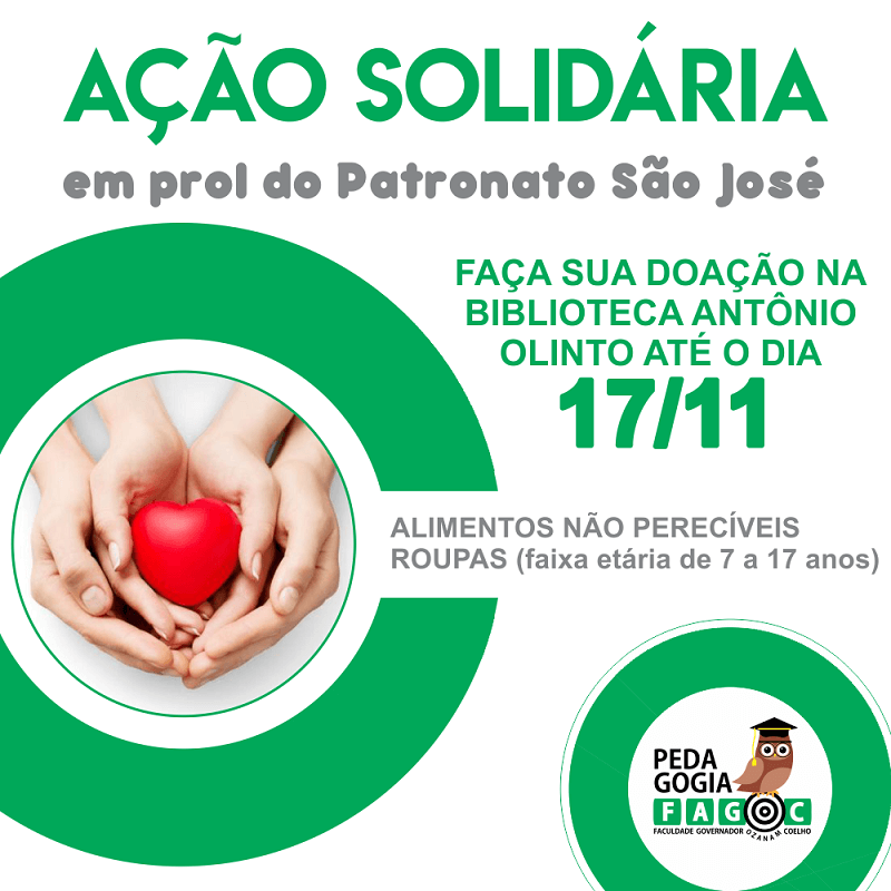 Os alunos do segundo período de Pedagogia da Fagoc promovem, até o dia 17 de novembro, uma campanha de arrecadação de alimentos não perecíveis e também de roupas para o Patronato São José, da cidade de Ubá. As doações podem ser deixadas em uma caixa na Biblioteca Antônio Olinto.
