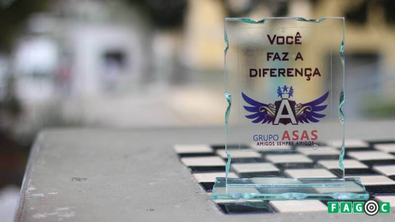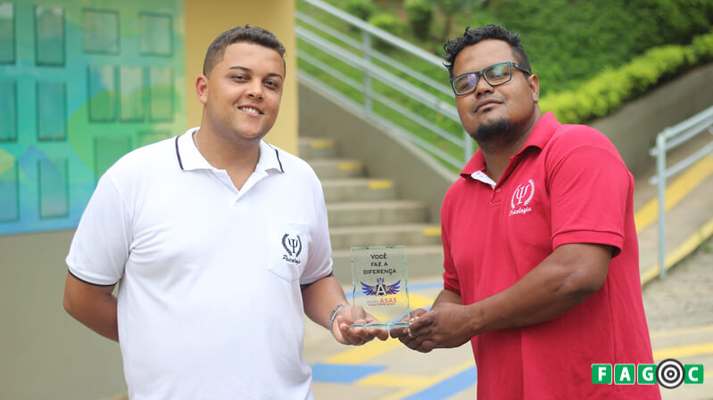 A Fagoc, representada pelos alunos do quarto período do curso de Psicologia Marcos Luiz Teixeira e Gilberto Rodrigues Barbosa, recebeu o prêmio “Você Faz a Diferença”, pelos serviços prestados durante o ano ao Grupo Amigos Sempre Amigos (ASAS), de Ubá. A instituição, situada no bairro São Domingos, ajuda famílias que possuem parentes dependentes químicos.