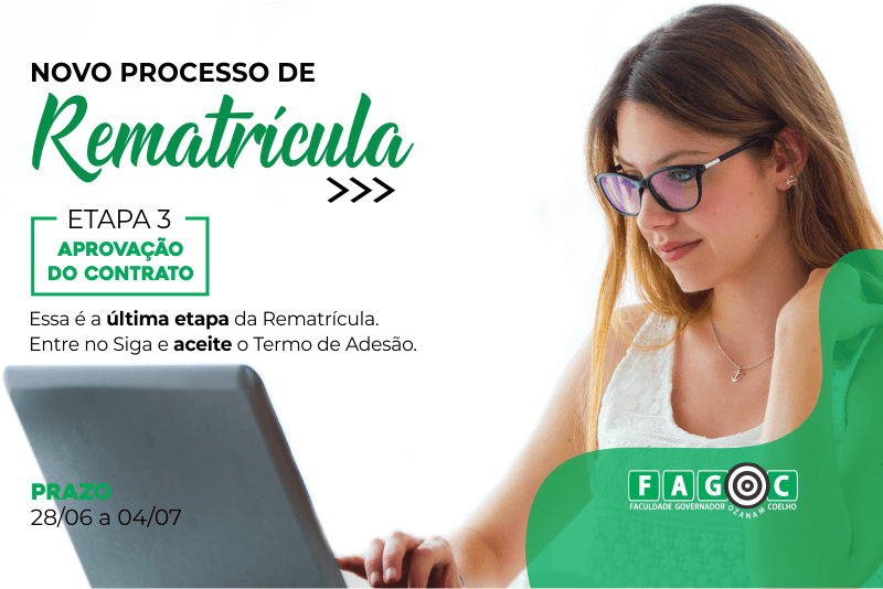 Depois de demonstrar a intenção em continuar na UniFagoc e realizar a montagem da grade, chegou a hora do estudante realizar a última etapa da Rematrícula para o segundo semestre de 2019: aprovar o contrato.