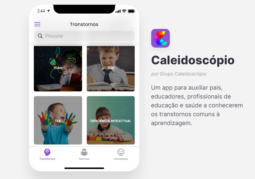 Os alunos do décimo período do curso de Psicologia do UNIFAGOC Ariane Duarte, Antônio Reis e Adriana Molone criaram o aplicativo Caleidoscópio, que visa auxiliar aqueles que convivem com pessoas diagnosticadas com transtornos como Dislexia, Discalculia, Disortografia, DisgrafiaTranstorno do Déficit de Atenção com Hiperatividade (TDAH), Transtorno Desafiador de Oposição (TOD), Transtorno do Espectro Autista (TEA) e Deficiência Intelectual.