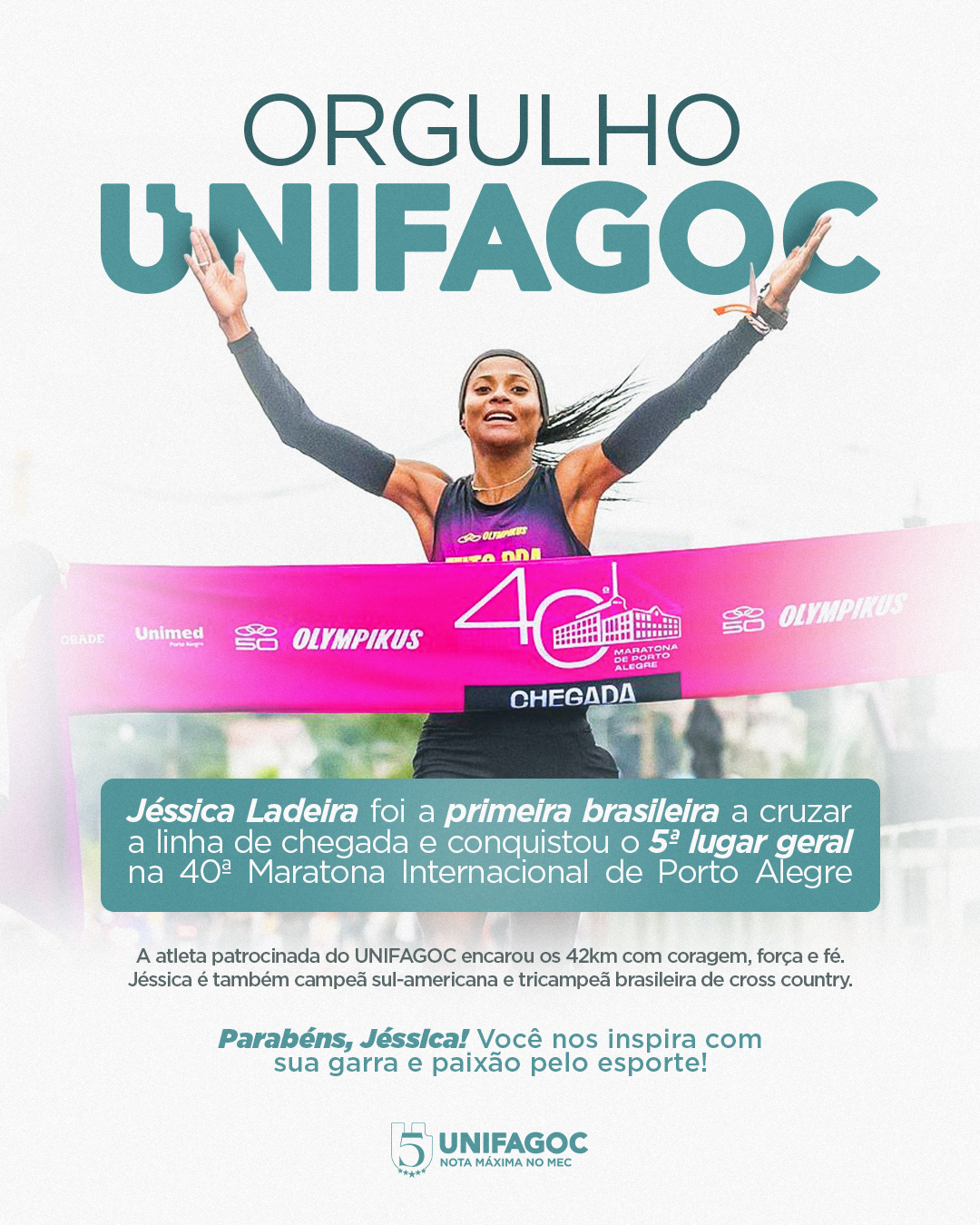 A atleta Jéssica Ladeira, patrocinada pelo UNIFAGOC, brilhou mais uma vez nas pistas e reforçou seu nome entre os grandes nomes do atletismo nacional. Na 40ª Maratona Internacional de Porto Alegre, realizada no dia 8 de junho, Jéssica fez história ao ser a primeira brasileira a cruzar a linha de chegada, conquistando o 5º lugar geral na competição. Uma vitória que eleva ainda mais o nível do atletismo feminino nacional e inspira novas gerações de corredoras.