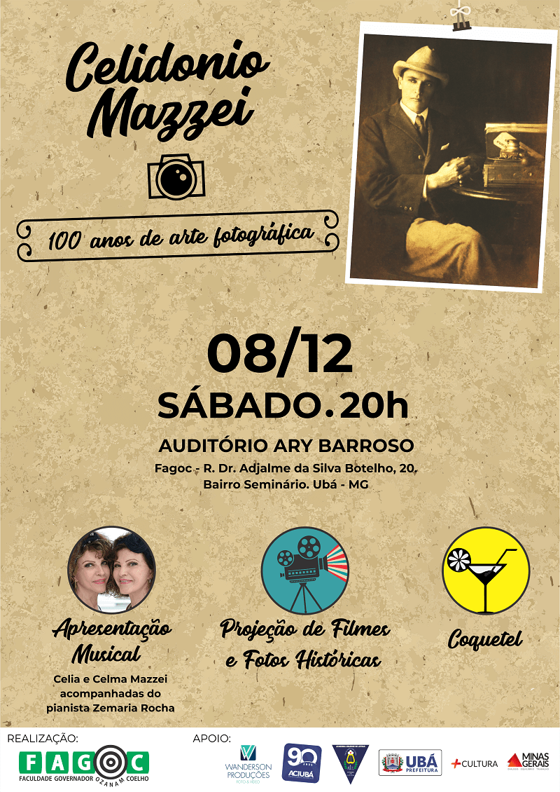 Serão feitas projeções de filmes e exposição de fotografias históricas da autoria do renomado fotógrafo Celidônio Mazzei,considerado pioneiro na arte da fotografia em Ubá. Foi ele quem trouxe, do Rio de Janeiro, as primeiras câmeras reflex e iluminação por spot light. Seu acervo possui registros de importantes políticos e artistas brasileiros considerados raros para a cidade e região. Responsável por uma das primeiras revelações em cores feitas no Brasil, exerceu a profissão de fotógrafo por sessenta anos.