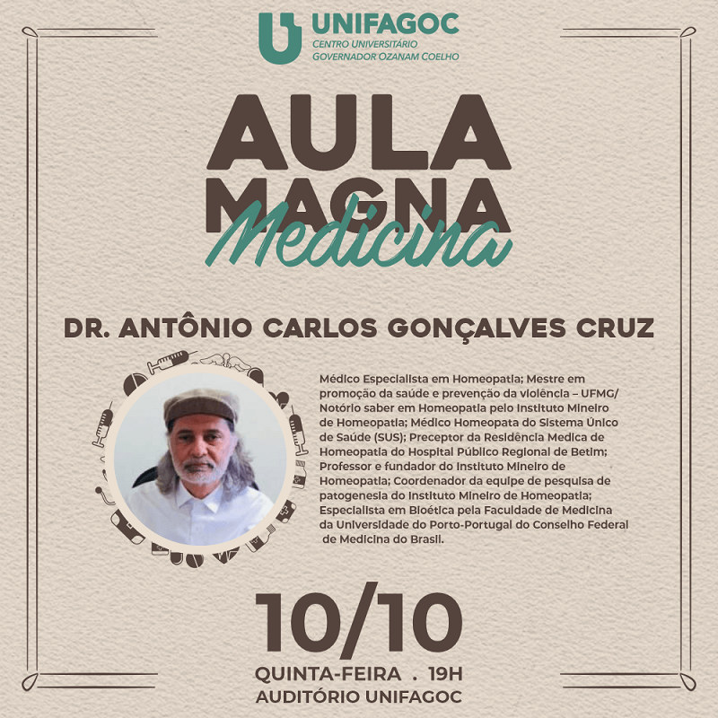 Nesta quinta-feira (10), o curso de Medicina do UNIFAGOC realiza a tradicional Aula Magna da graduação. O convidado especial para esta edição da iniciativa é o Médico Especialista em Homeopatia, doutor Antônio Carlos Gonçalves Cruz. O evento, que é aberto à comunidade, será realizado no Auditório Ary Barroso, a partir das 19h.