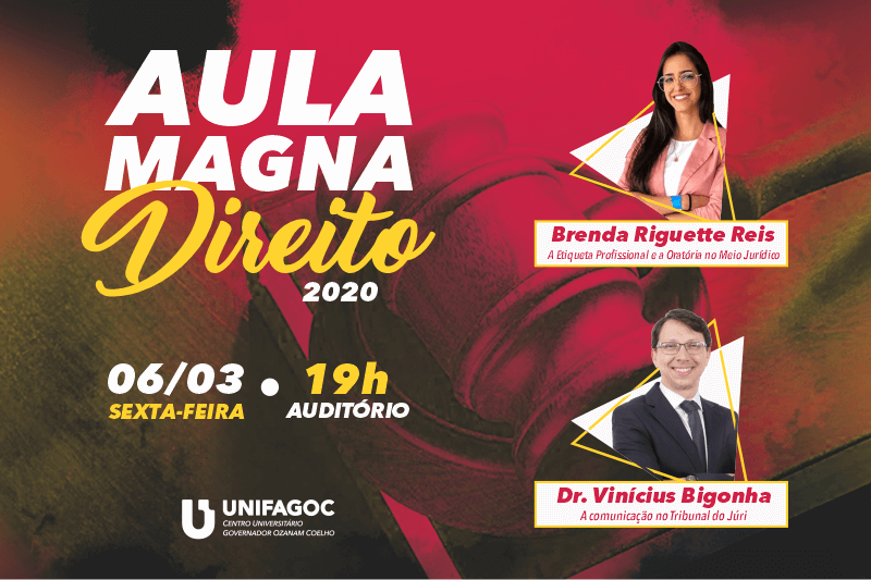 A tradicional Aula Magna do curso de Direito do Centro Universitário UNIFAGOC já tem data marcada. O evento, que simboliza o início do semestre letivo da graduação, acontece no dia 06 de março (sexta-feira), às 19h no Auditório Ary Barroso, campus da instituição.