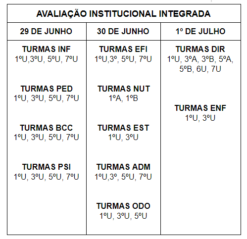 A Avaliação Institucional Integrada (AII) do primeiro semestre será realizada nos dias 29, 30 de junho e 1º de julho, das 19h às 22h40. O exame, que tem por objetivo medir a qualidade do aprendizado e o desempenho dos estudantes ao longo do período, é destinado a todos os cursos da UniFagoc.