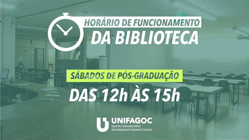 A Biblioteca Antonio Olinto do Centro Universitário UNIFAGOC passará a funcionar novo horário nos sábados de Pós-Graduação. Nestes dias, será possível utilizar o espaço e fazer empréstimo de materiais no horário das 12h às 15h.
