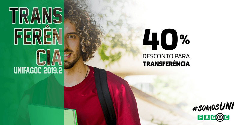 A UniFagoc oferece uma condição especial para transferência. O aluno de outra instituição de ensino superior que deseja se transferir para o Centro Universitário recebe 40% de desconto na matrícula e nas mensalidades no segundo semestre deste ano. Nos semestres subsequentes, o estudante tem direito a 25% de desconto em suas mensalidades até a conclusão do curso. Confira o regulamento AQUI.