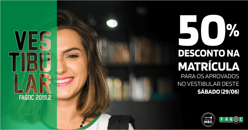 Os candidatos presentes e aprovados no Vestibular da Fagoc que será realizado neste sábado (29) serão beneficiados com 50% de desconto na matrícula.