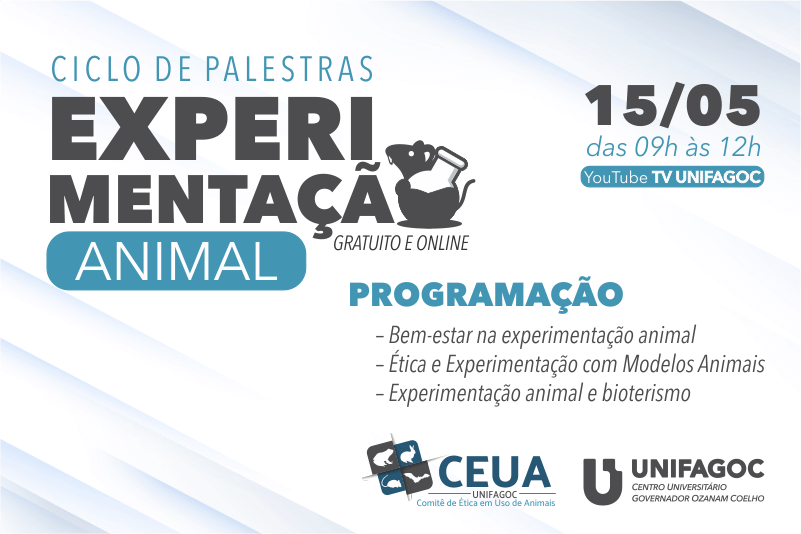 A fim de apresentar conhecimentos básicos aos alunos que pretendem trabalhar com animais de laboratório, o Comitê de Ética no uso de Animais(CEUA) do UNIFAGOC promove um ciclo de palestras com o tema Experimentação Animal, no dia 15 de maio, das 09h às 12h. As palestras acontecerão de forma remota e serão transmitidas pelo canal do Youtube TV UNIFAGOC.
