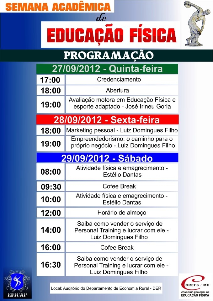 UNIFAGOC Começa nesta quinta -feira a Semana Acadêmica de Educação Física da UFV Publicado em 26/09/2012por Developer Unifagoc Compartilhe: