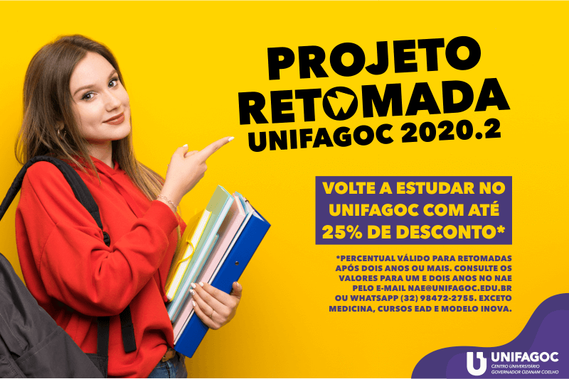 Os alunos do UNIFAGOC que não concluíram o estudos e que desejam retomar a graduação podem conseguir até 25% de desconto durante todo o curso por meio do Projeto Retomada. Esse incentivo é válido para todos os cursos presenciais, exceto Medicina e Nutrição. Confira o regulamento AQUI.
