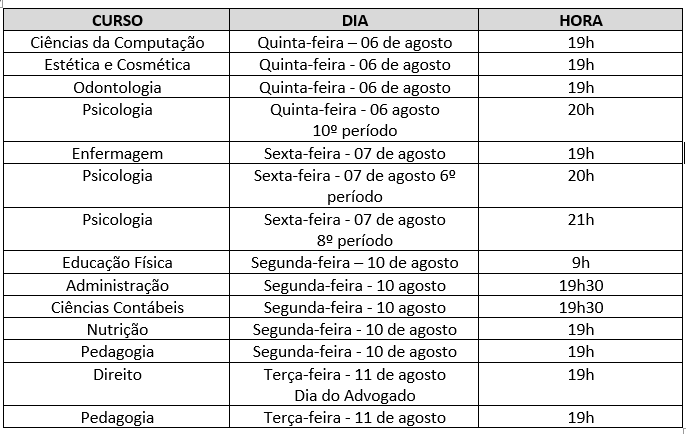 Uma Reunião Remota será realizada nos dias 06, 07, 10 e 11 de agosto, a partir das 19h, pelo Diretor de cada curso da Instituição para suas turmas, a fim de detalhar todas as mudanças. Os alunos serão comunicados pelo Diretor de seu curso sobre a plataforma em que a reunião será realizada. Cinfira abaixo as datas e horário de cada reunião: