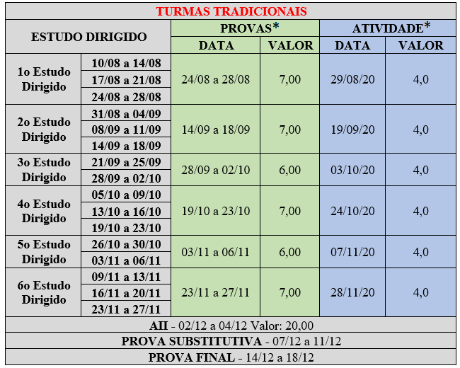 Havendo a autorização pelos órgãos competentes para retorno das aulas presenciais, o calendário continua válido fazendo adaptações no sistema apresentado. Caso isto aconteça, a instituição irá emitir um comunicado oficial à toda comunidade acadêmica.