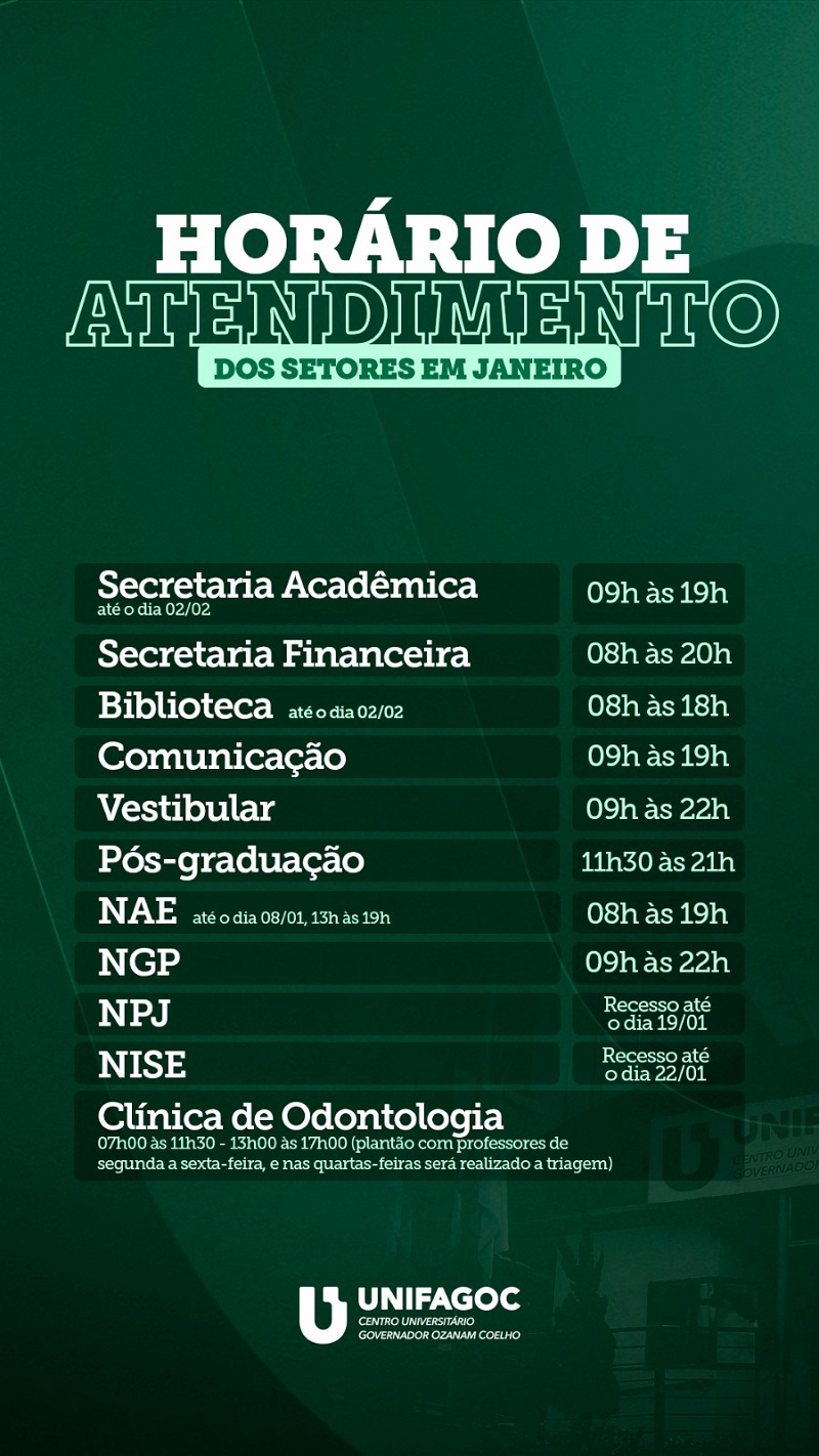 Durante este período, alguns setores da Instituição entram em recesso, enquanto outros atendem em horários diferentes, que seguem até o fim do mês, retornando o horário normal no dia 02 de fevereiro.
