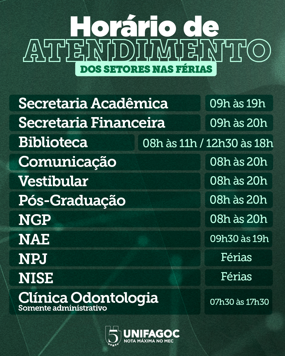 Enquanto os alunos do centro universitário UNIFAGOC estão de férias, a instituição segue funcionando com atendimentos e com os preparativos para o segundo semestre de 2025. Alguns setores, neste período, atuam em horários diferenciados e outros estão em período de férias. Esses horários seguirão até o início das aulas. Lembrando que o volta às aulas acontecerá no dia 04 de agosto para os alunos do curso de Medicina e em 11 de agosto para os demais cursos. Confira abaixo: