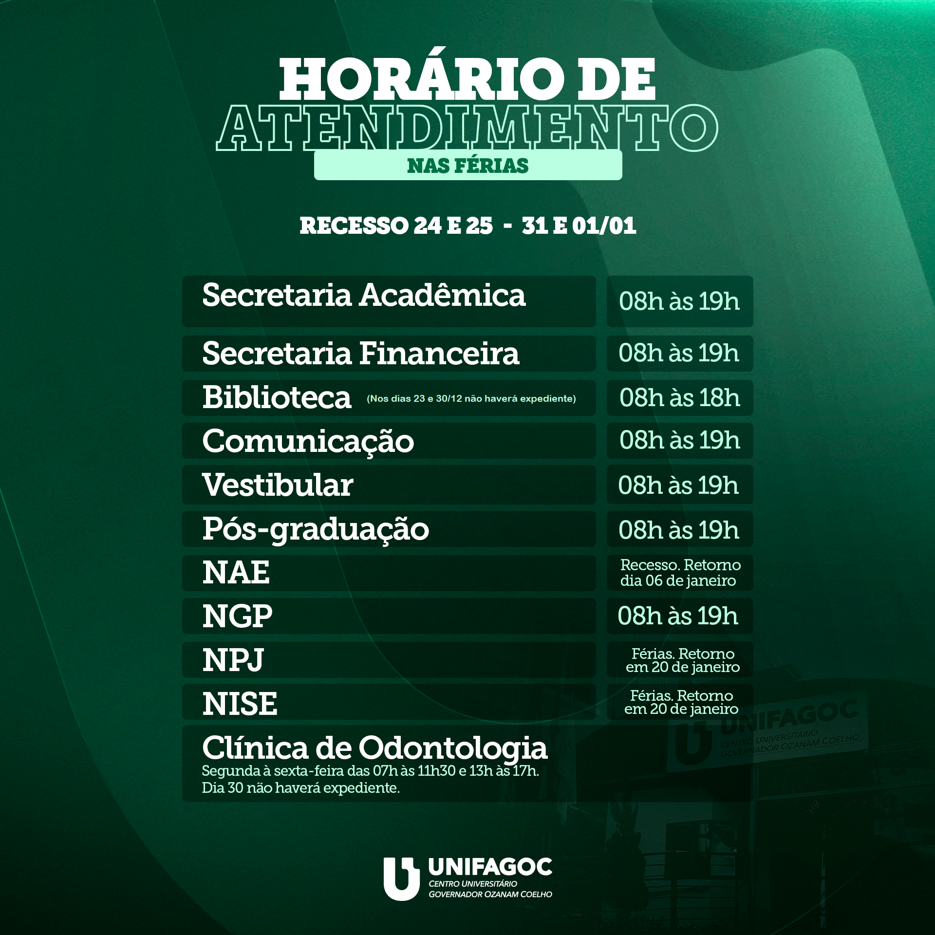 Clínica de Odontologia – segunda à sexta-feira das 07h às 11h30 e 13h às 17h. Dia 30 não haverá expediente.