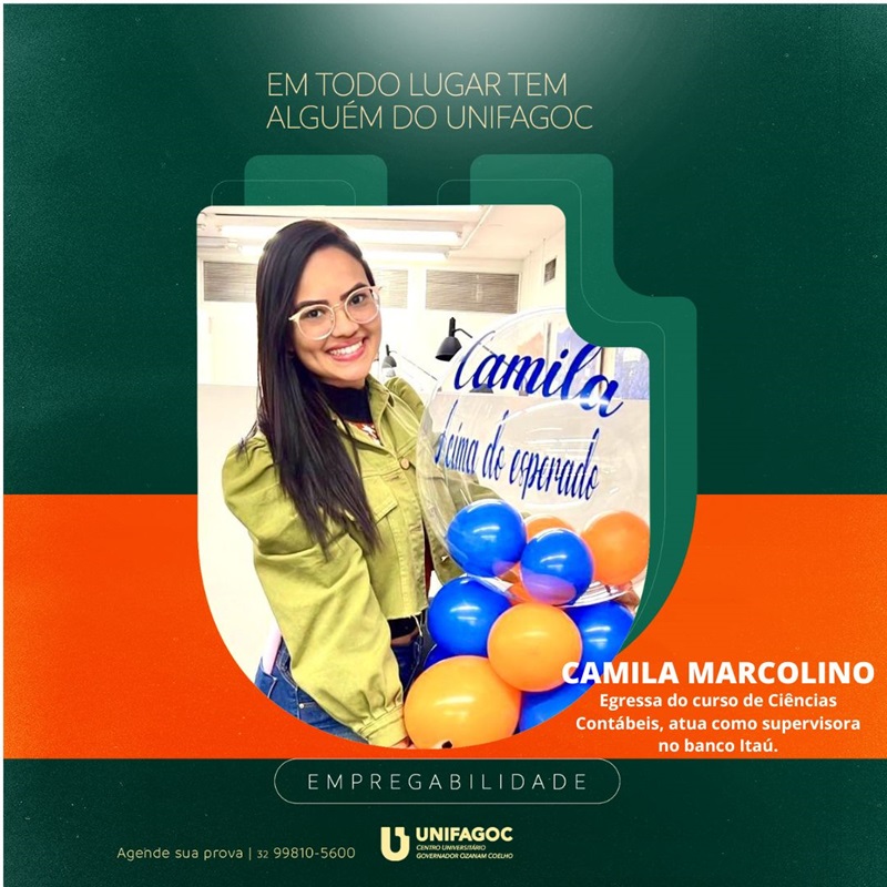 – Camila Marcolino, egressa do curso de Ciências Contábeis, atua como supervisora no banco Itaú.