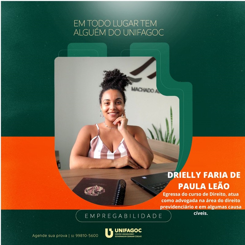 – Drielly Faria de Paula Leão, egressa do curso de Direito, atua como advogada na área do direito previdenciário e em algumas causa cíveis.