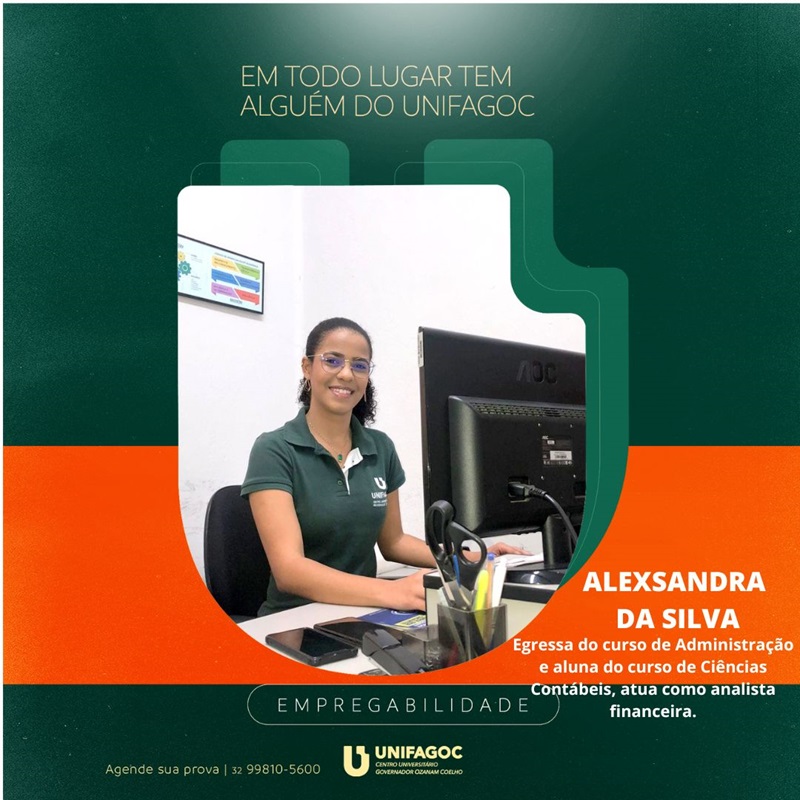 – Alexsandra Da Silva, egressa do curso de Administração e aluna do curso de Ciências Contábeis, atua como analista financeira.