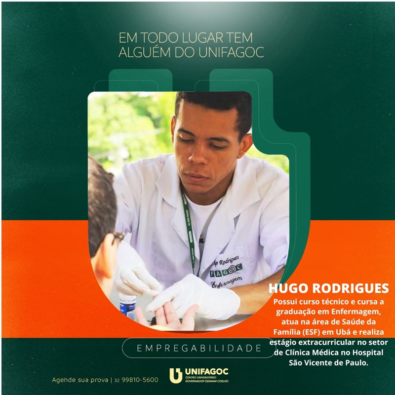 – Hugo Rodrigues, possui curso técnico e cursa a graduação em Enfermagem, atua na área de Saúde da Família (ESF) em Ubá e realiza estágio extracurricular no setor de Clínica Médica no Hospital São Vicente de Paulo.