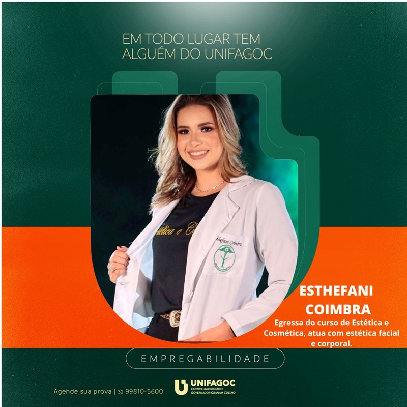 – Esthefani Coimbra, egressa do curso de Estética e Cosmética, atua com estética facial e corporal.