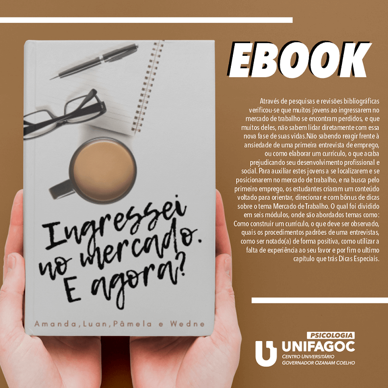 O ebook Ingressei no mercado de trabalho e agora?, criado pelos alunos do décimo período da graduação de Psicologia do UNIFAGOC Amanda Zanini, Luan Costa, Pâmela Magalhães e Wedne Silva, reúne um conteúdo com dicas, informações e orientações que têm o objetivo de auxiliar jovens que estão em busca do primeiro emprego.