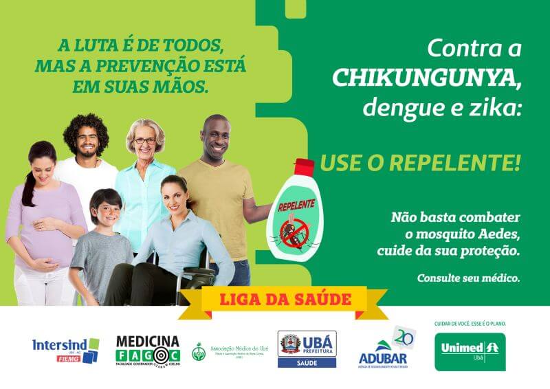 Use o repelente! Esse é o mote da campanha realizada pela Liga da Saúde contra Chikungunya, Dengue e Zika, doenças transmitidas pelo mosquito Aedes Aegypti. A Liga da Saúde é uma parceria entre o curso de Medicina da Fagoc, a Unimed, a Associação Médica de Ubá e Região (Amur), a Agência de Desenvolvimento de Ubá e Região (Adubar), a Prefeitura Municipal de Ubá e o Intersind.