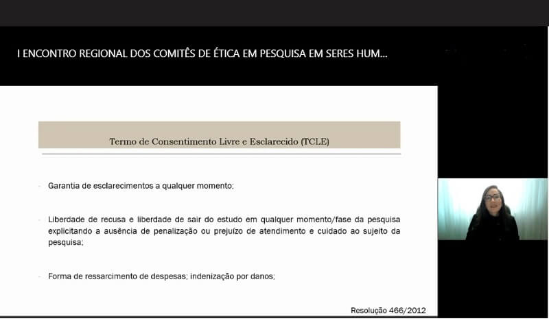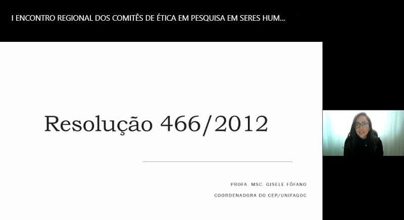 Na oportunidade, Gisele discorreu sobre a Resolução nº 466/2012, que se trata de uma importante resolução do sistema CEP da Comissão Nacional de Ética em Pesquisa (CONEP), ressaltando a importância de que todos os projetos que envolvam seres humanos devem ser apreciados pelo Comitê de Ética em Pesquisa com Seres Humanos.
