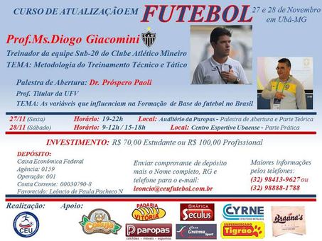 Ubá sedia curso de atualização em futebol nesta sexta (27) e sábado (28). A palestra “As variáveis que influenciam na Formação de Base do futebol no Brasil” ministrada pelo professor Próspero Paoli, abre o evento na sexta-feira das 19h às 22h, no Auditório da Paropas.