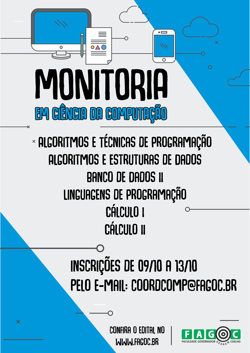 Estão abertas as inscrições do processo seletivo para monitoria do curso de Ciência da Computação da Fagoc.