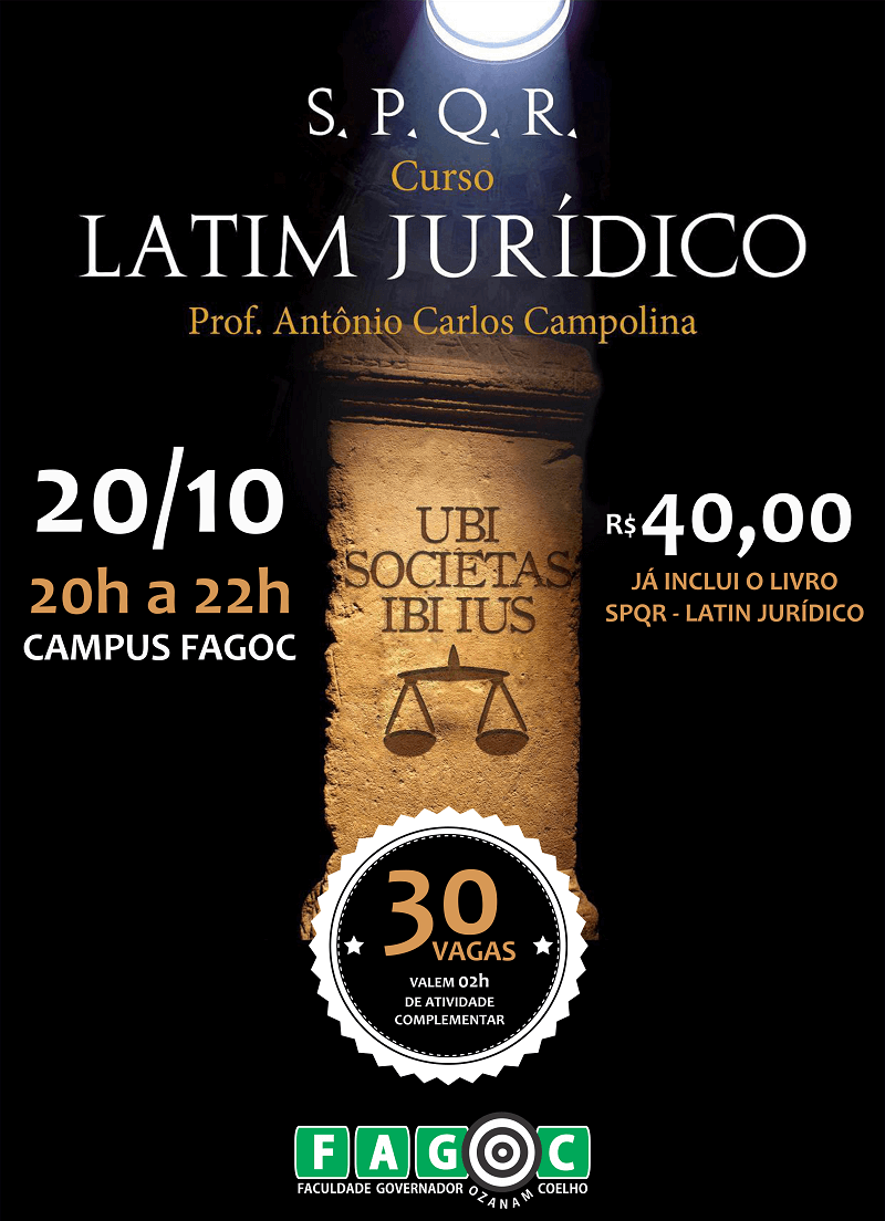 O curso de Direito da Fagoc promove um curso especial sobre Latim Jurídico. A atividade, que tem vagas limitadas, acontece no dia 20 de outubro no campus da faculdade.
