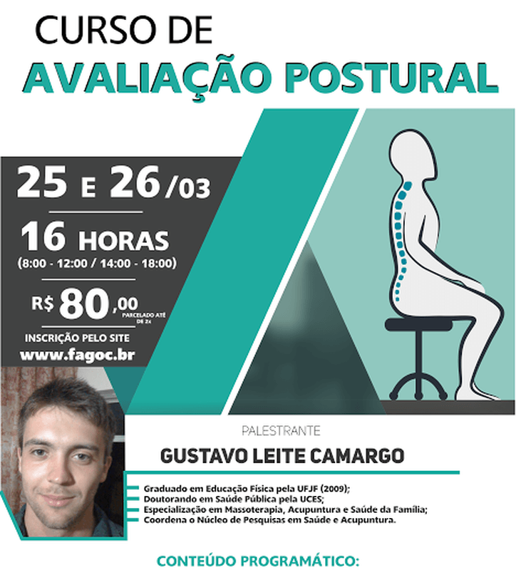 Nos dias 25 e 26 de março (sábado e domingo), o curso de Educação Física da Fagoc promove o workshop “Avaliação Postural”. O treinamento possui carga horária de 16 horas e será realizado de 8h as 12h e das 14 às 18h, na sala 28, no campus da instituição. As inscrições podem ser realizadas neste link.