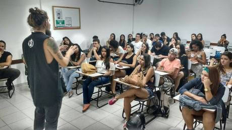 Alunos de jornalismo com o palestrante Hércules Rakauska na oficina de Fotografia de eventos.