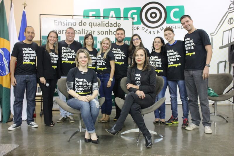 Professores, alunos e as jornalistas convidadas com a camisa "Pauta, Editorial, Apuração, Notícia & Web" feita exclusivamente para o início do semestre.