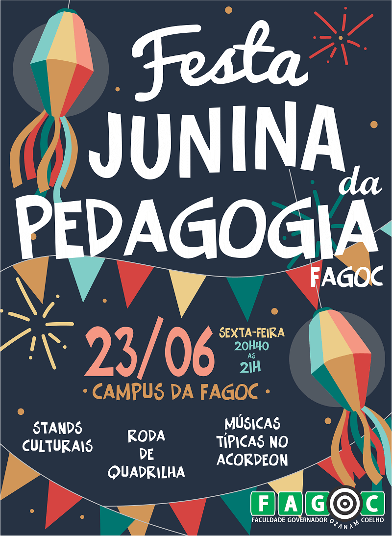 A Festa Junina da Pedagogia Fagoc vai movimentar o campus no dia 23 de junho (sexta-feira). O evento acontece durante o intervalo das aulas do período noturno, das 20h40 às 21h, e terá stands com informações culturais sobre os elementos presentes nas festas Juninas, além da tradicional roda de quadrilha, com músicas típicas no acordeon. Todos poderão participar da "dança de roda".