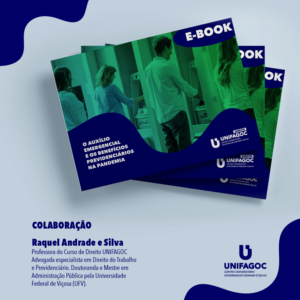 A advogada e professora do curso de Direito do UNIFAGOC Raquel de Andrade e Silva reuniu, em um e-book, informações e análises feitas por ela a respeito do Auxílio Emergencial ofertado pelo Governo Federal para esse período de pandemia da COVID-19 e sobre os benefícios previdenciários nesse mesmo contexto.