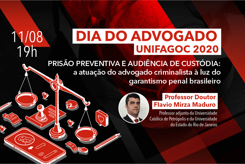 No Dia do Advogado, comemorado em 11 de agosto (terça-feira), o curso de Direito do UNIFAGOC promove um evento online que abordará o tema Prisão Preventiva e Audiência de Custódia: A Atuação do Advogado Criminalista à Luz do Garantismo Penal Brasileiro. A transmissão irá acontecer a partir das 19h no canal do Youtube TV UNIFAGOC.